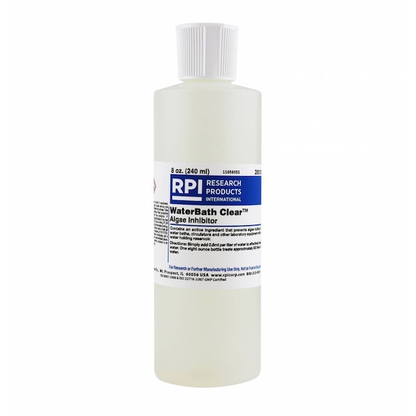 WaterBath Clear contains an active organic ingredient that inhibits Algae growth in water baths and incubators. Ensures crystal clear water and prevents algae growth. Keeps the water bath free from algae, reducing the need for frequent cleaning and maintenance. By preventing algae buildup, it ensures that the water bath operates at peak efficiency, providing consistent and reliable temperature control for experiments. Algae Inhibitor reduces the risk of contamination, ensuring that your samples are maintained in a clean environment, which is crucial for accurate and reproducible results.Simply add 0.5ml per liter of water to effectively treat water. Economical to use. Eight ounces treats approximately 500 liters of water.Recommended Usage Weekly: If the water bath is used frequently and especially if it's in a high-traffic lab, changing the water once a week is recommended to prevent contamination and maintain optimal performance. Biweekly: If the water bath is used less frequently or is well-maintained with a good water treatment system like an algae inhibitor, changing the water every two weeks may be sufficient.Monthly: In some low-use cases with effective water treatment and minimal risk of contamination, you might be able to change the water once a month, but this should be accompanied by regular checks for clarity and cleanliness. Storage Temperature: Room TemperatureStorage Conditions: Room TemperatureAppearance: Clear to slightly yellow liquid pH 10%, solution: 6.5 - 8.3 Solubility: Freely Soluble Specific Gravity: 1.00 BSE/TSE Free: BSE/TSE Free Shipping Weight: 0.6301 lbsShipping Dimensions: 2.00 x 6.50 x 2.00Research or further manufacturing use only, not for food or drug use.