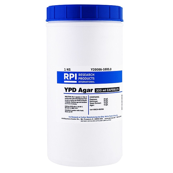YPD Agar, Purity Greater Than 95 Percent, Container Size 1 kg, Form Caplet, Solubility Water, Storage Temp. Room Temperature, Shelf Life 18 mo, Package Quantity 46