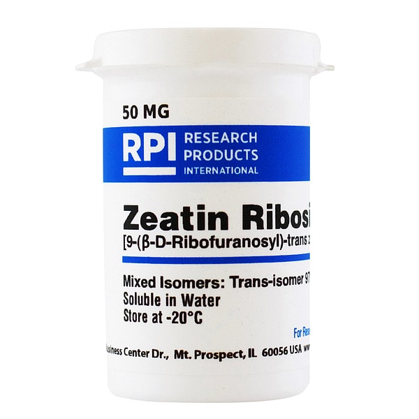 Zeatin Riboside, CAS Number 6025-53-2, Purity Greater Than 95 Percent, Container Size 50 mg, Form Powder, Molecular Weight 351.4, Solubility Water, Storage Temp. 2 Degrees to 8 Degrees C, Chemical Formula C15H21N5O5, Shelf Life 18 mo
