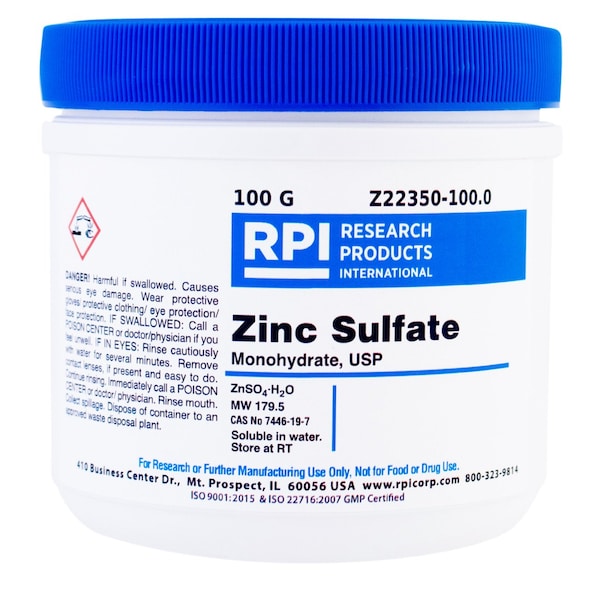 CAS Number: 7446-19-7Molecular Weight: 179.5Chemical Formula: ZnSO4 H2OSolubility: WaterStorage Temperature: Room TemperatureStorage Conditions: Room TemperatureAppearance: White Powder Odor: odorless Solubility: Soluble in Water & Glycerin. Insoluble in Alcohol Identification Zinc and Sulfate=+VE: Pass Assay: 99.0 - 100.5 %Acidity: As per USP Alkalies & Alkaline Earths: 0.9 %Arsenic: 0.0014 %Lead Pb: 0.002 %Residual Solvents: As per USP Grade: USP BSE/TSE Free: BSE/TSE Free Non Animal Origin: Non Animal Origin Country of Origin: Report Shipping Weight: 0.3201 lbsShipping Dimensions: 3.50 x 3.75 x 3.50Research or further manufacturing use only, not for food or drug use.