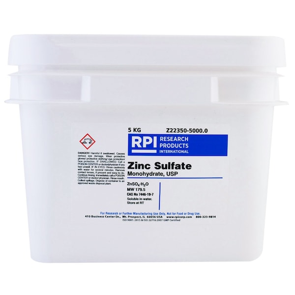 CAS Number: 7446-19-7Molecular Weight: 179.5Chemical Formula: ZnSO4 H2OSolubility: WaterStorage Temperature: Room TemperatureStorage Conditions: Room TemperatureAppearance: White Powder Odor: odorless Solubility: Soluble in Water & Glycerin. Insoluble in Alcohol Identification Zinc and Sulfate=+VE: Pass Assay: 99.0 - 100.5 %Acidity: As per USP Alkalies & Alkaline Earths: 0.9 %Arsenic: 0.0014 %Lead Pb: 0.002 %Residual Solvents: As per USP Grade: USP BSE/TSE Free: BSE/TSE Free Non Animal Origin: Non Animal Origin Country of Origin: Report Shipping Weight: 12.4301 lbsShipping Dimensions: 10.00 x 7.50 x 10.00Research or further manufacturing use only, not for food or drug use.