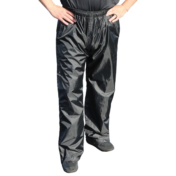 Rain Pants, Nylon with Polyester Coating, Pull On Closure, Black, Size Mens M