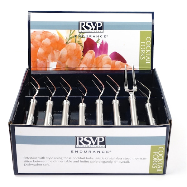 We strive to offer quality kitchen products and cooking tools at competitive prices.1/2 Our Endurance Cocktail Forks, 24 piece CDU is a perfect example. The universal design mixes well with your everyday flatware. Bring them out at your next dinner party when appetizers are being served. Each fork is made of polished 18-8 stainless steel with a contrasting satin finish handle and measures 6-inches in overall length. Dishwasher safe. Sold here in an attractive counter display box. When all the right people, and ingredients, kitchen tools, and food come together, we call this The Art of Gathering.