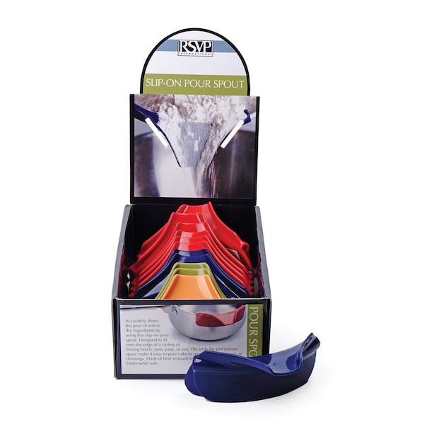 We strive to offer quality kitchen products and cooking tools at competitive prices.1/2 Our slip-on pour spout, 12 piece cdu is a perfect example. Attach this spout to the edge of a variety of mixing bowls, pots, pans or jars to create a wide lip and narrow spout for easy pouring. Made from dishwasher safe, heat resistant silicone up to 480 degrees Fahrenheit, 250 degrees Celsius. Each spout measures 4-inches by 3-inches. Sold here in an attractive counter display box which contains an assortment of Red, Blue, Orange and Green. When all the right people, and ingredients, kitchen tools, and food come together, we call this the art of gathering.