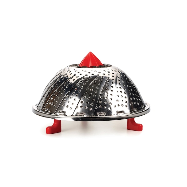 We strive to offer quality kitchen products and cooking tools at competitive prices.1/2 Our endurance 'steaming in the rain' vegetable steamer, 9-inches diameter is a perfect example. Preserve essential vitamins and minerals in your vegetables steaming them. Constructed from durable stainless steel which provides a durable way to steam your vegetables in. It also features a Red silicone Umbrella at the top with Red silicone Boots as the feet of the steamer. This steamer is easy to use, just put it at the bottom of a pot and the steamer basket will expand. The Red silicone rain Boots at the bottom of the steamer will not scratch cookware and the silicone Umbrella handle will also keep your hands safe from heat. Measures 12-inches in diameter by 4-inches tall. Dishwasher safe for quick and easy clean up. When all the right people, and ingredients, kitchen tools, and food come together, we call this the art of gathering.