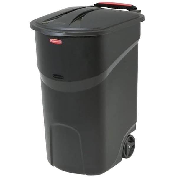 Rubbermaid Wheeled Trash Can with Lid, 45 gal Capacity, Plastic, Black, Hinged Closure, 22 in Width, 26 in Depth, 37 in Height, ErgonomicComfortGrip Handle