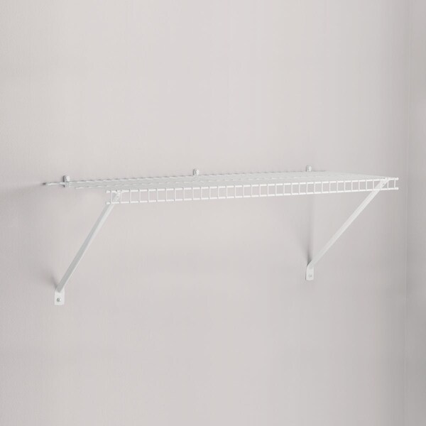 Rubbermaid Linen Shelving with Hardware provides extra storage for laundry rooms and linen closets. Ventilated design promotes air circulation. Maximize storage space with shelving on top and clothes hanging area below. Durable epoxy-coated design. Installation hardware and 2 support braces included.