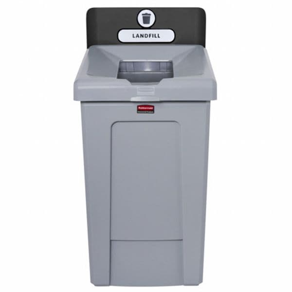 Recycling Station, For Recyclable Material Trash, Trash Container Capacity 33 gal, Top Type Flat with Top Opening, Number of Containers 1, Number of Openings 1, Container Markings Landfill, Total Capacity 33 gal, Color Black, Container Shape Rectangular, Height 40 1/8 in, Width/Diameter 19 3/4 in, Depth 21 1/8 in, Material Grouping Plastic, Specific Container Material Plastic, Finish Unfinished, Location Indoor, Mobility Stationary, Lid Connection Snap On, Container Mounting Style Free-Standing