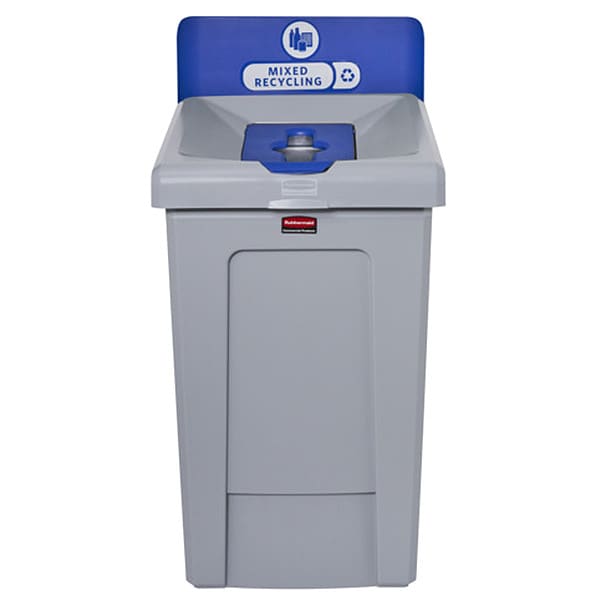 Recycling Station, For Recyclable Material Bottle, Can, Glass, Paper, Plastic, Trash Container Capacity 33 gal, Top Type Flat with Top Opening, Number of Containers 1, Number of Openings 1, Container Markings Mixed Recycling, Total Capacity 33 gal, Color Blue, Container Shape Rectangular, Height 40 1/8 in, Width/Diameter 19 3/4 in, Depth 21 1/8 in, Material Grouping Plastic, Specific Container Material Plastic, Finish Unfinished, Location Indoor, Mobility Stationary, Lid Connection Snap On