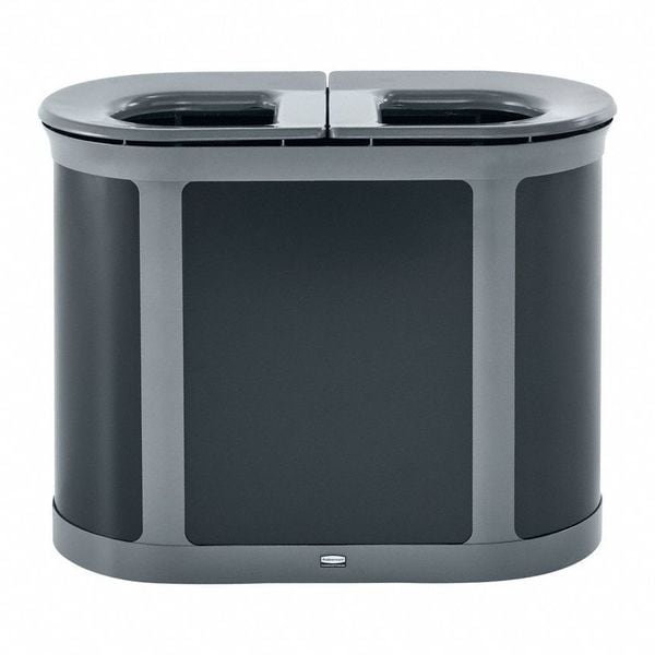 Recycle Can, For Recyclable Material Bottle, Can, Compost, Paper, Trash, Trash Container Capacity (2) 23 gal, Top Type Flat with Top Opening, Number of Containers 1, Number of Openings 2, Container Markings None, Total Capacity 46 gal, Color Gray, Container Shape Oval, Height 31 3/4 in, Width/Diameter 21 3/4 in, Depth 41 1/2 in, Material Grouping Metal, Specific Container Material Metal, Finish Powder Coated, Location Indoor, Mobility Stationary, Lid Connection Hinged