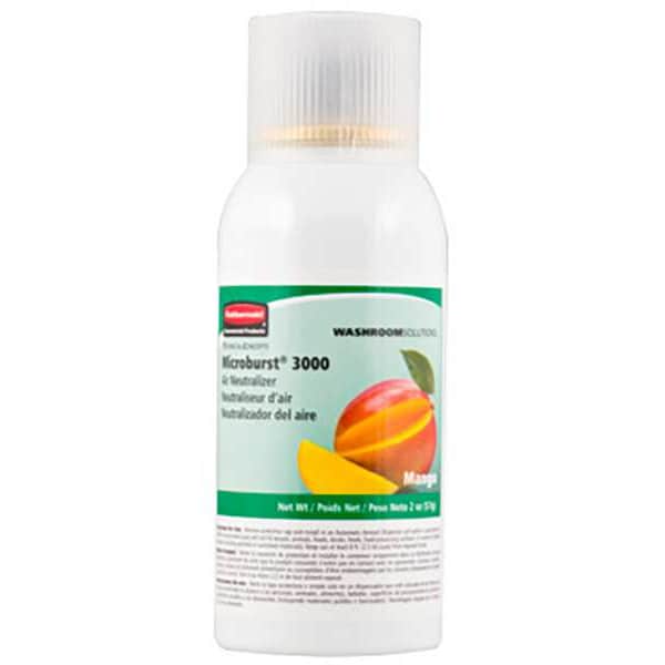 Aerosol Air Freshener Refill, Liquid, Fragrance Mango, Aerosol Spray, 2.6 oz, Product Series Microburst 3000, Refill Life 168 day, NSF Rating Not Rated, Coverage 6,000 cu ft, Light Yellow, Compatible Grainger Part Number 22PT68, 52JR39, Compatible Mfg. Model Number 1793532, Length 1 7/8 in, Width 1 7/8 in, Height 4 7/8 in, Net Weight 3 lb, Package Quantity 12