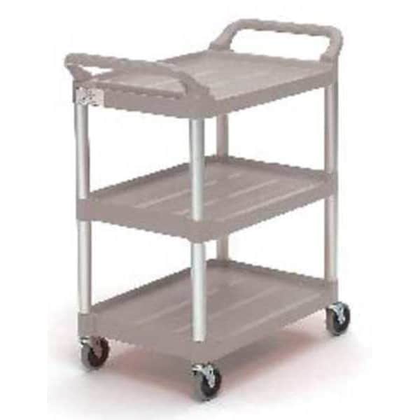 Dual-Handle Utility Cart with Lipped Plastic Shelves, Number of Shelves 3, Lip Style 4-Sided Lipped, Load Capacity 200 lb, Shelf Length 28 3/8 in, Shelf Width 17 5/8 in, Top Shelf Height 37 3/4 in, Distance Between Shelves 11 3/4 in, Distance Between Top and Middle Shelf 11 3/4 in, Distance Between Middle and Bottom Shelf 11 3/4 in, Handle Type (2) Raised, Handle Height 37 3/4 in, Caster Brake Type No Brake Included, Caster Wheel/Tread Material Elastomer, Caster Wheel Dia. 4 in