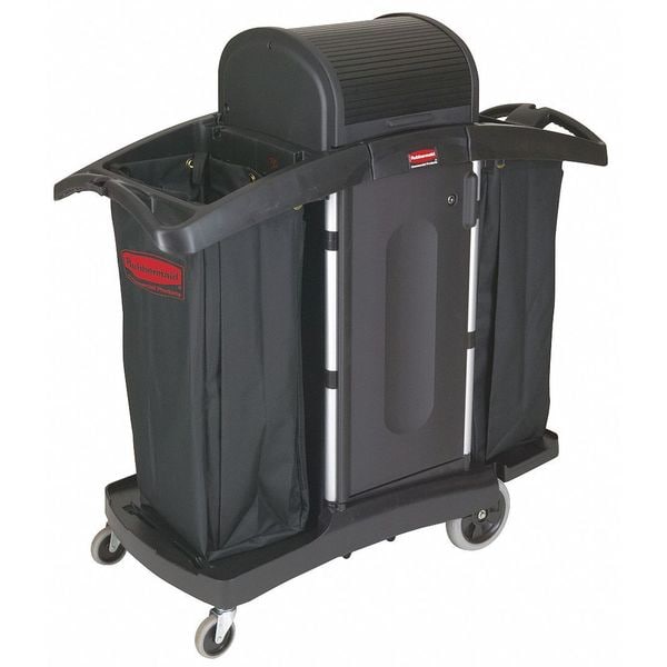 Housekeeping Cart, Overall Depth 52 in, Overall Height 54 in, Includes (2) 10 qt Removable Disinfecting Caddies, Double Door Locking Kit, Molded Tool Organizer, Vacuum Holder, Includes Bins Yes, Includes Shelves Yes, Includes Waste Container Yes, Lockable Yes, Number of Shelves 3, Waste Container Capacity 68 gal, Overall Width 22 in, Features Interchangeable Handles and Removable Platform, Ergonomic Design, Water and Chemical Resistant Finish, Frame Color Black, Lock Type Lockable, Weight 79 lb
