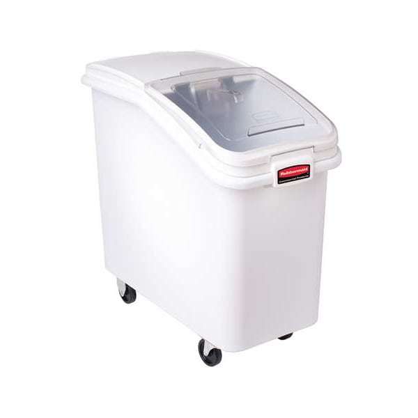 Mobile Bulk Storage, Lid Color Clear, Lid Included Yes, Overall Height 28 in, Bin Style Mobile, Dishwasher Safe Yes, First In First Out Compatible No, Includes Scoop, Product Type Ingredient Bin, Capacity 500 qt, Color White, Overall Length 29 1/2 in, Overall Width 15 1/2 in, NSF Certified Yes