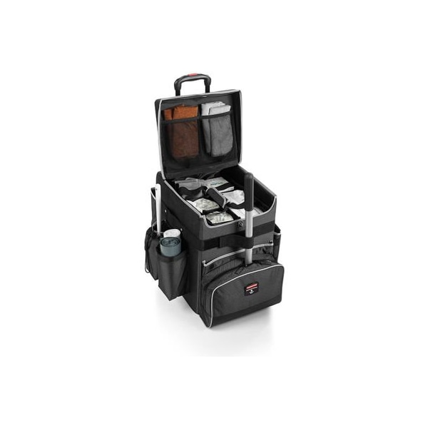 Rubbermaid medium executive quick cart 1902466 - dark gray the industry's most durable mobile cart solution that empowers staff to maintain areas discreetly and efficiently. Provide a premium guest experience, keeping the cleaning process hidden from view of guests. Easily move throughout the property with a lightweight, compact, and durable construction. Repels water, oil, and stains with fabric protector coating to maintain aesthetics and protect against daily use. Adjustable dividers helps organize amenities and supplies. Aluminum telescoping handle is dependable for heavy daily use. Features a heavy duty strap and large front pocket that will hold a flexible flat mop or sweeper. Deliver a flexible solution, customizable for the unique needs of your property.