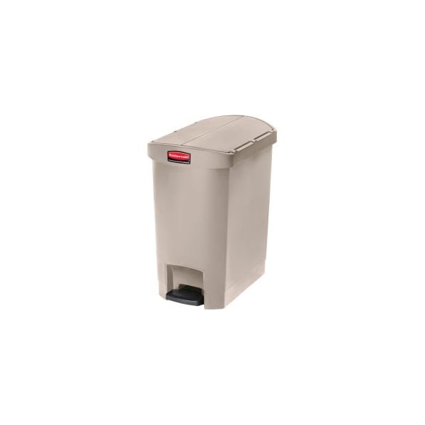 RUBBERMAID® SLIM JIM® PLASTIC STEP ON CONTAINER END STEP, 8 GALLON - BEIGE SLIM JIM® STEP ON TRASH CONTAINERS ARE CONSTRUCTED WITH HIGH-QUALITY PLASTIC THAT MEET THE NEEDS OF ANY ENVIRONMENT WITH EFFICIENCY, SAFETY, AND DURABILITY. SLIM PROFILE AND SMALL FOOTPRINT MAXIMIZE SPACE TO FIT IN TIGHTEST SPACES. SMOOTH SURFACES AND CONTOURED EDGES ARE EASY TO CLEAN. RUBBERMAID® SLIM JIM® CONTAINER FEATURES A QUIET AND CONTROLLED LID-CLOSURE WHICH MINIMIZES NOISE, AN INTERNAL HINGE DESIGN THAT PREVENTS WALL DAMAGE AND AN INCREASED FOOT PEDAL CLEARANCE FOR EASIER ACCESS AND OPERATION. LINER CINCH EASILY AND SECURELY HOLDS TRASH BAG LINERS. FACTORY MUTUAL CERTIFIED ENSURES FIRE SAFETY FOR REGULATORY COMPLIANCE. MEETS OSHA AND OBRA STANDARDS FOR WORKER AND ENVIRONMENTAL SAFETY.