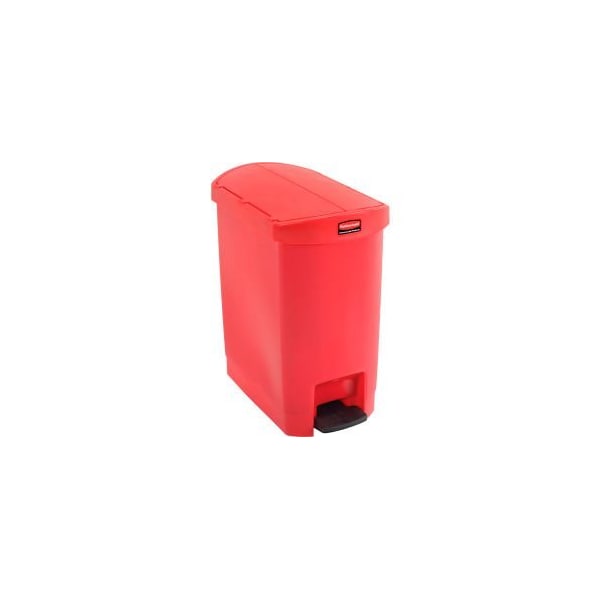 RUBBERMAID® SLIM JIM® PLASTIC STEP ON CONTAINER END STEP, 8 GALLON - RED SLIM JIM® STEP ON TRASH CONTAINERS ARE CONSTRUCTED WITH HIGH-QUALITY PLASTIC THAT MEET THE NEEDS OF ANY ENVIRONMENT WITH EFFICIENCY, SAFETY, AND DURABILITY. SLIM PROFILE AND SMALL FOOTPRINT MAXIMIZE SPACE TO FIT IN TIGHTEST SPACES. SMOOTH SURFACES AND CONTOURED EDGES ARE EASY TO CLEAN. RUBBERMAID® SLIM JIM® CONTAINER FEATURES A QUIET AND CONTROLLED LID-CLOSURE WHICH MINIMIZES NOISE, AN INTERNAL HINGE DESIGN THAT PREVENTS WALL DAMAGE AND AN INCREASED FOOT PEDAL CLEARANCE FOR EASIER ACCESS AND OPERATION. LINER CINCH EASILY AND SECURELY HOLDS TRASH BAG LINERS. FACTORY MUTUAL CERTIFIED ENSURES FIRE SAFETY FOR REGULATORY COMPLIANCE. MEETS OSHA AND OBRA STANDARDS FOR WORKER AND ENVIRONMENTAL SAFETY.