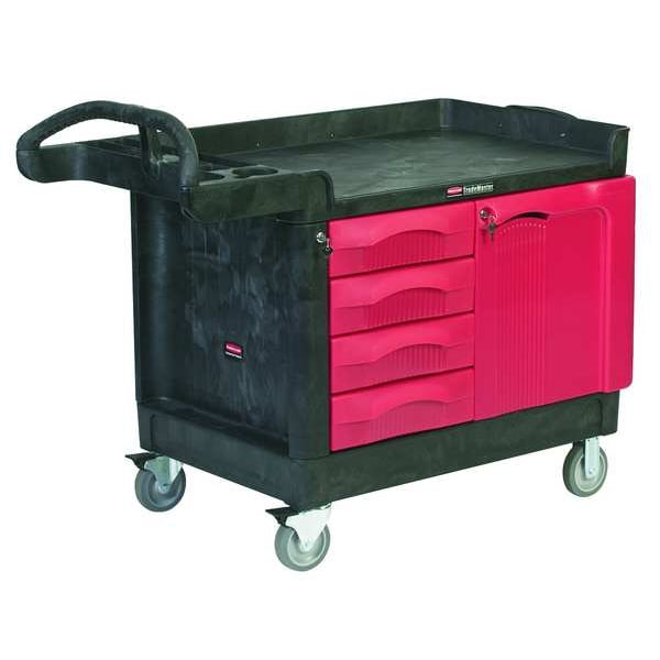 Mobile Cabinet Workbench, Top Material Plastic, Color Black, Number of Doors 1, Number of Drawers 4, Number of Shelves 1, Overall Depth 26 1/4 in, Overall Height 38 in, Overall Load Capacity 750 lb, Overall Width 49 in, Top Metal Material Gauge Not Applicable, Included Components Handle on Side, Power Strip, Assembly Partially Assembled, Caster Type (2) Rigid, (2) Swivel, Door Type Standard/Hinged, Frame Material Plastic, Frame Metal Material Gauge Not Applicable