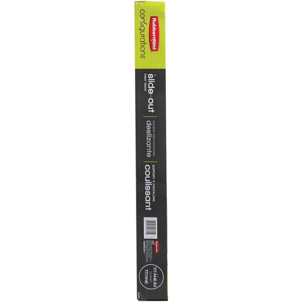 Rubbermaid Configurations Sliding Pants Rack. Durable and stylish organization rods for hanging pants. Rubber grippers prevent pants from sliding off. Ball bearing glides ensure easy sliding. Mount separately or share bracket with a shelf for maximum storage space. Holds 7 pairs of pants. 2.25 In. H. x 20.13 In. W. x 16.5 D. assembled dimensions.