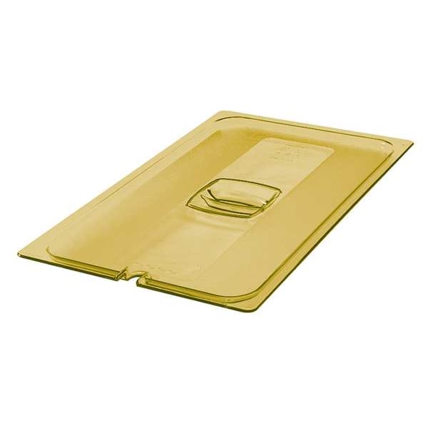 Hot Food Pan Cover w Peg Holes, Half Size, Overall Length 12 13/16 In., Overall Width 10 3/8 In., Overall Height 1/2 In., Color Amber, Material Polycarbonate
