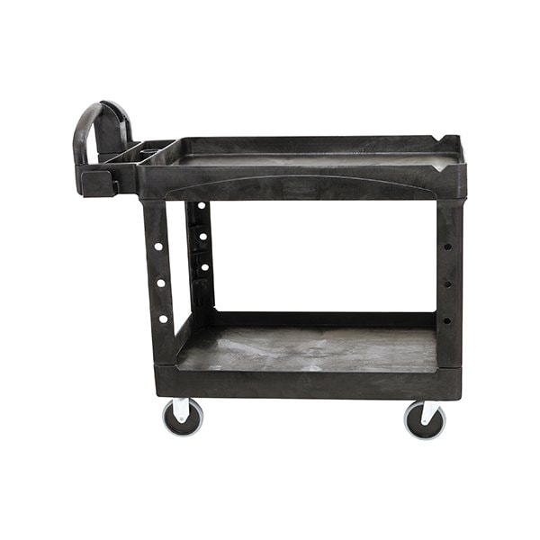 Lightweight cart with rounded edges to protect walls and furniture. Handle compartments and molded fittings for more storage; Built-in tool holder and cord wrap; Ergonomic push handle for optimum hand placement; Non-marking, 5'' casters - 2 swivel and 2 rigid; 2 1/2'' deep trays that are 19 3/4'' apart; Assembly required; Optional Extension Drawer - Stock Number RUB485 available. This product is equivalent to part number: H-2471BL.