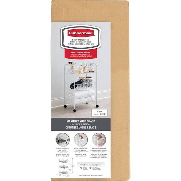 Rubbermaid Freestanding 3-Tier Mobile Wheeled Cart Storage Solution White. Multipurpose mobile storage solution with durable casters that enable easy movement across hardwood carpet and tile flooring. Easy to assemble with no tools required. Slim design fits into a variety of tight spaces. Large durable handles to help steer cart when in motion. Basket style shelving prevents items from falling out. Sturdy metal construction prevents cart from tipping over. Durable casters easily glide across different floor types without damaging floor.