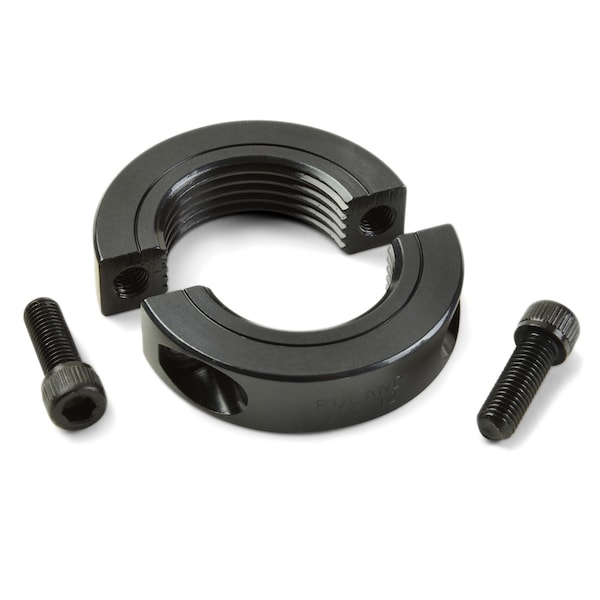 Ruland clamp style shaft collars do not mar the shaft, are infinitely adjustable, and have superior holding power when compared to set screw collars. This two-piece acme threaded shaft collar has a 3/8" - 16 TPI bore, 7/8" OD, and 0.343" width. Threads are double tapped to ensure a burr-free finish which extends shaft life and allows for easier installation. Acme threading allows for higher axial holding power than traditional threaded collars. Tightly controlled face to bore perpendicularity is maintained (TIR of < 0.002") which is critical when the collar is used as a load bearing face, mechanical stop, or for component alignment. The work surface is identified by one groove on the face allowing the user to easily identify which side is precision faced. The two-piece design allows this collar to be installed or serviced in-place without the need to remove adjacent components. Halves are mated throughout the manufacturing process for precise fit and increased holding power. This collar is stamped with the Ruland name and bore size for ease of identification. It is manufactured from 303 stainless steel to a fine burr-free finish with hardware of like material for consistent corrosion resistance. Hardware tests beyond ANSI standards for maximum holding power. It is RoHS and REACH compliant.