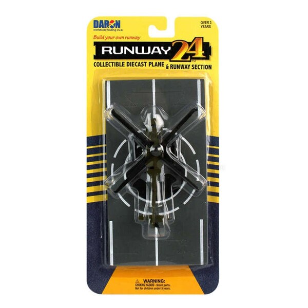 This fabulous line of diecast aircraft is great for the young collector. Runway24 features a large variety of vintage and modern aircraft, ranging from bi-planes to the most recent jets and helicopters. Each model also includes a section of runway. Features Model - Black Hawk Helicopter. May require basic assembly. Expertly designed. True to life detail. Imaginative accents. Warning Choking Hazard - Small Parts not for Children under 3 years.