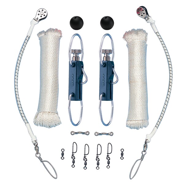 Top Gun Rigging Kit w/Klickers. Complete rigging packages that allow you to run One (1) lines on each rigger. this kit includes (2) exclusive Rupp single pulley shock cords, 50ft of white braided nylon halyard lines one pair of Rupp KLICKER release clips. (2) Nylon ball stops, (2) Strap Eyes, (4) Snap Swivels, (2) Swivels. This rigging kit is for small outriggers, 20' and under.