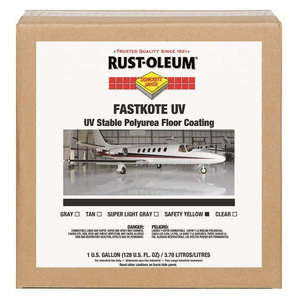 Floor Coating, Solvent Base Type, Polyurea Resin Type, VOC Content 20.2g/L, Size 1 gal., Color Safety Yellow, High Gloss Finish, Coverage 400 sq. ft., Dry Time Tack Free 1 hr., Dry Time - Light Traffic 4 hr., Dry Time 24 hr., Dry Time Recoat 3 hr., Application Temperature 50 to 90 Degrees F, Application Method Roller, Concrete, Exposure Conditions Interior/Exterior