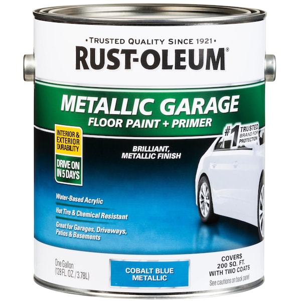 Rust-Oleum Metallic Garage Floor Paint and Primer is a ready-to-use, self-priming coating designed for both interior and exterior concrete surfaces. Ideal for garages, basements, porches, patios, walkways, driveways, pool decks and much more. This water-based acrylic floor coating provides excellent durability and protection from UV rays, weather, hot tire pick-up, stains and chemicals. Accepts foot traffic in 4 to 6 hours and vehicle traffic in 5 days. Covers up to 250 square feet per gallon.