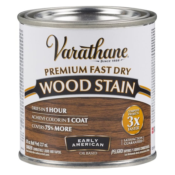 Varathane Fast Dry Wood Stain, Premium, Liquid, Early American, 0.5 pt, Composition: Mineral Spirits, Resin Solution, Stoddard Solvents, Aromatic Petroleum Distillates, 1,2,4-Trimethylbenzene, Coverage: 225 - 275 sq-ft/qt, Curing Time: 1 hr to Touch, 1 hr to Recoat and 24 hr to Full Cure at 70 deg F and 50% Relative Humidity, 60 - 90 deg F Application, 104 deg F Flash Point, 549 g/L VOC, 0.878 Specific Gravity, Solvent Odor, Applicable Materials: Wood, Application Method: Brush/Lint Free Rag