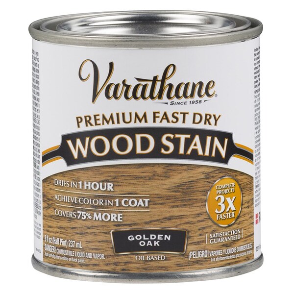 Varathane Fast Dry Wood Stain, Premium, Liquid, Golden Oak, 0.5 pt, Composition: Mineral Spirits, Resin Solution, Stoddard Solvents, Aromatic Petroleum Distillates, 1,2,4-Trimethylbenzene, Coverage: 225 - 275 sq-ft/qt, Curing Time: 1 hr to Touch, 1 hr to Recoat and 24 hr to Full Cure at 70 deg F and 50% Relative Humidity, 60 - 90 deg F Application, 104 deg F Flash Point, 550 g/L VOC, 0.86 Specific Gravity, Solvent Odor, Applicable Materials: Wood, Application Method: Brush/Lint Free Rag