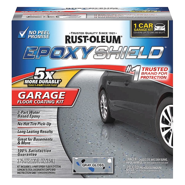 Garage Floor Kit, Base Type Water, Resin Type Amine Cured Epoxy, Color Gray, Finish Gloss, Size 120 fl oz, VOC Content Less Than 50 g/L, Coverage 250 sq ft, Exposure Conditions Mild to Moderate, Dry Time 72 hr, Cure Time 72 hr, Application Temperature 60 Degrees to 85 Degrees F, For Use With Garage Floors, Includes 2-part Epoxy Mixture, Floor Degreaser, Skid-Resistant Color Chips, Stir Stick