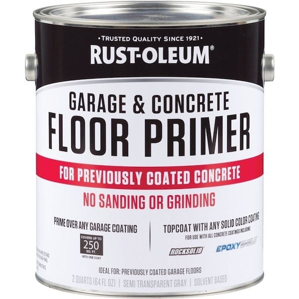 Rust-Oleum garage and concrete floor primer is a ultra-premium, solvent based primer/bonder with excellent top coat adhesion and has been developed to be used over previously coated garage floors. No sanding, stripping or grinding is required. The previously coated floor must be clean and properly adhered prior to priming. After use of the Rust-Oleum garage and concrete primer, your floor is ready to be topcoated with any opaque epoxy paint, 2-part epoxy or RockSolid polycuramine. Use of clear topcoats over Rust-Oleum garage and concrete primer is not recommended.