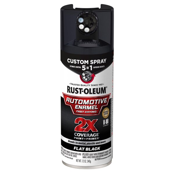 Automotive Enamel Spray, Base Type Solvent, Color Family Black, Compatible Surface Material Metal, Plastic, Wood, Sheen Flat, Finish Texture No Texture, Resin Type Acrylic Enamel, Color Black, Container Size 12 oz, Coverage Area 10 to 12 sq ft, Sub Brand 2X Automotive Enamel with Custom Spray 5-in-1, Paint Dispensing Style Any Angle, Coating Application Automotive Spray Paint, Container Type Spray Can, Dry Time 48 hr