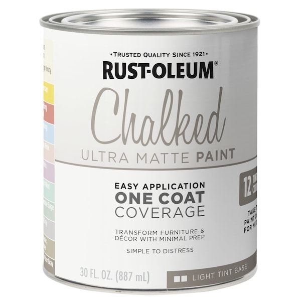 Rust-Oleum Chalked Paint creates an ultra matte finish with excellent coverage and adhesion. It transforms and rejuvenates furniture and home decor with a smooth matte finish. This paint provides one coat coverage on most surfaces without special surface preparation or priming. It can be painted or distressed, giving any project a one-of-a-kind look. Rust-Oleum Chalked Paint can be used on wood, metal, ceramic, glass, canvas and more.