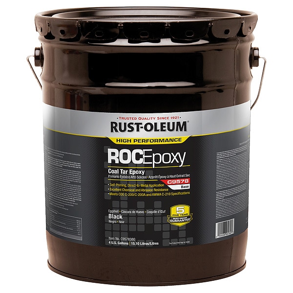 Coal Tar Epoxy Coating Base, Base Type Solvent, Resin Type Polyamide Converted Epoxy Blended with Refined Coal Tar, Color Black, Finish Matte, Size 5 gal, VOC Content Less Than 250 g/L, Coverage 100 to 130 sq ft/gal, Exposure Conditions Marine Environments, Severe Industrial, Dry Time 3 to 36 hr, Cure Time 18 to 36 hr, Application Temperature 50 Degrees to 100 Degrees F, For Use With 3XH20, Epoxy Activator, Activator Properties Low VOC Activator, System Series C9578