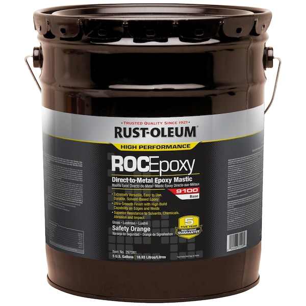 Direct-to-Metal Protective Coating Base, Base Type Solvent, Resin Type Epoxy Mastic, Color Safety Orange, Finish Gloss, Size 5 gal, VOC Content 199 g/L, Coverage 125 to 225 sq ft/gal, Exposure Conditions Moderate to Severe, Dry Time Varies, Cure Time Depends On Activator, Application Temperature 50 Degrees to 120 Degrees F, For Use With 9101300, Activator Properties Fast Cure Activator, Immersion Activator, Low Temperature Activator, Standard Activator, System Series 9100