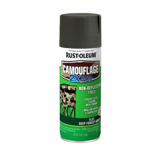 General Purpose Spray Paint, Opacity 0 Percent, Maximum Dry Film Thickness 2 mil, Coating Application General Purpose, Color Family Green, Compatible Surface Material Metal, Plaster, Wood, Sheen Ultra-Flat, Finish Texture No Texture, Resin Type Acrylic Modified Alkyd, Color Deep Forest Green, Container Size 12 oz, Coverage Area 8 to 12 sq ft, Base Type Solvent, Dry Time 1 hr, Use Location Exterior, Interior, Sub Brand Camouflage 2X, Container Type Can, Dry Time to Recoat 1 hr