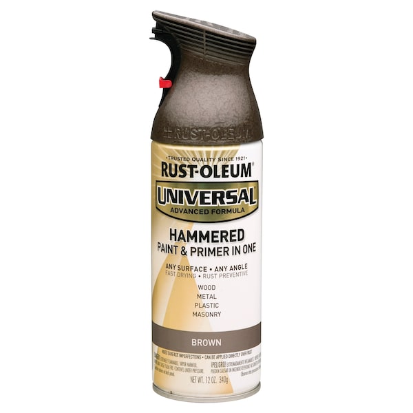 Hammered Spray Paint, Opacity 0 Percent, Maximum Dry Film Thickness 2 mil, Coating Application General Purpose Spray Paint, Color Family Brown, Compatible Surface Material Aluminum, Metal, Plastic, Wicker, Wood, Sheen Gloss, Finish Texture Hammered, Resin Type Modified Alkyd, Color Brown, Container Size 12 oz, Coverage Area 15 sq ft, Base Type Solvent, Dry Time 1 hr, Use Location Exterior, Interior, Sub Brand Universal, Container Type Aerosol Can, Dry Time Tack Free 30 min