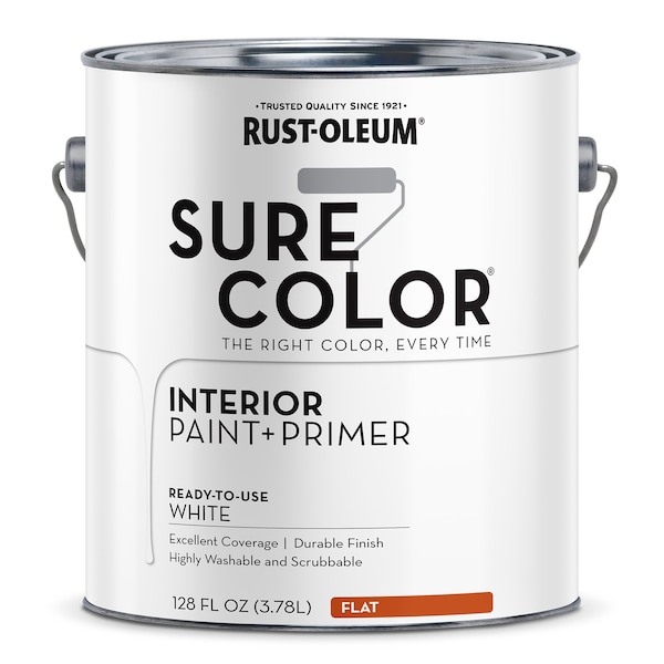 Rust-Oleum Sure Color Interior Wall Paint and Primer in One delivers an attractive, highly washable, scrubbable and long-lasting finish on a variety of indoor surfaces including walls, trim, doors, windows and more. This ready-to-use paint is designed for use on drywall, wood and masonry. This durable, water-based formula dries to the touch in only one hour and covers up to 400 square feet per gallon. Ideal for living rooms, bedrooms, other household areas and even garage walls. Apply with brush, roller or airless sprayer. Easy soap and water cleanup. Available in a variety of contemporary, on-trend colors.