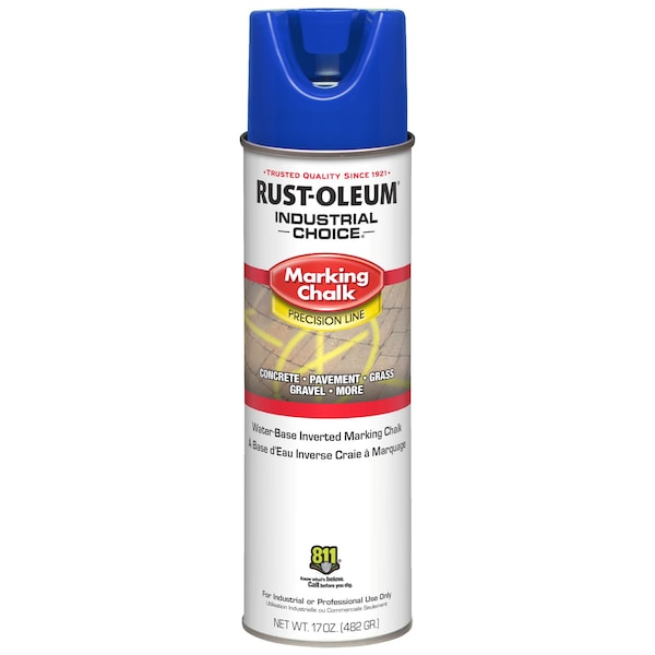 Inverted Marking Chalk, Water Base Type, Line Striping Aerosol Yes, Blue, Size 17 oz, Inverted Marking Chalk, Paint and Primer Surface Material Concrete, Grass, Gravel, Paint and Primer Application Method Marking Pistol, Marking Wand, Marking Wheel, Spray, Coverage 500 to 530 Linear ft/1-1/4 in Strip, Net Weight 17 oz, Dry Time 10 min, Dry Time Tack Free 5 min, Application Temperature 32 Degrees to 90 Degrees F, Mild to Moderate Exposure Conditions, Standards ANSI Z88.2, OSHA 1910.134