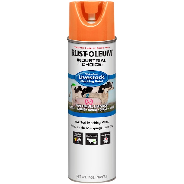 Rust-Oleum Industrial Choice Inverted Livestock Marking Paint is a fast dry, water-based formula that creates bright, easy-to-read marks on a variety of livestock. Safe to use on cattle, goats, swine, sheep and more. Ideal for heat detection tail painting and general livestock identification applications. This fade-resistant and weather-resistant coating will not irritate the livestock's skin. Excellent adhesion on wet surfaces. Can be sprayed in temperatures as low as 25 degrees Fahrenheit. Dries in less than 15 minutes. Covers up to 700 linear feet per can at 1 inch wide. Markings last up to 30 days. Compatible with the Rust-Oleum Industrial Choice Marking Pistol.