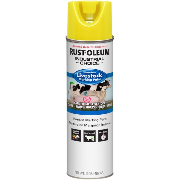 Rust-Oleum Industrial Choice Inverted Livestock Marking Paint is a fast dry, water-based formula that creates bright, easy-to-read marks on a variety of livestock. Safe to use on cattle, goats, swine, sheep and more. Ideal for heat detection tail painting and general livestock identification applications. This fade-resistant and weather-resistant coating will not irritate the livestock's skin. Excellent adhesion on wet surfaces. Can be sprayed in temperatures as low as 25 degrees Fahrenheit. Dries in less than 15 minutes. Covers up to 700 linear feet per can at 1 inch wide. Markings last up to 30 days. Compatible with the Rust-Oleum Industrial Choice Marking Pistol.