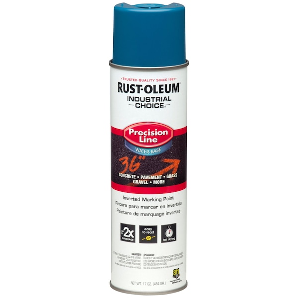 Precision Line Marking Paint, Water Base Type, Line Striping Aerosol Yes, Caution Blue/APWA Blue, Size 17 oz, Precision Line Marking Paint, Paint and Primer Surface Material Asphalt, Concrete, Dirt, Grass, Gravel, Paint and Primer Application Method Marking Pistol, Marking Wand, Marking Wheel, Spray, Coverage 600 to 700 Linear ft/2 in Strip, Net Weight 17 oz, Dry Time Less Than 5 min, Dry Time Tack Free 5 min, Application Temperature 40 Degrees to 90 Degrees F