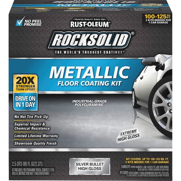 RockSolid Metallic Floor Coating contains pearlescent and iridescent accents that produce marbleized gleaming finishes. Perfectly suited for high traffic areas like garages and workshops but still safe enough to be used in other interior spaces like basements laundry rooms and family rooms. Features: industrial grade polycuramine chemical resistant no peel committment no hot tire pickup low odor and low VOC. Drive on in 24 hours. Kit covers 100 to 125 Sq. Ft. - 2 kits needed for 1-car garage.