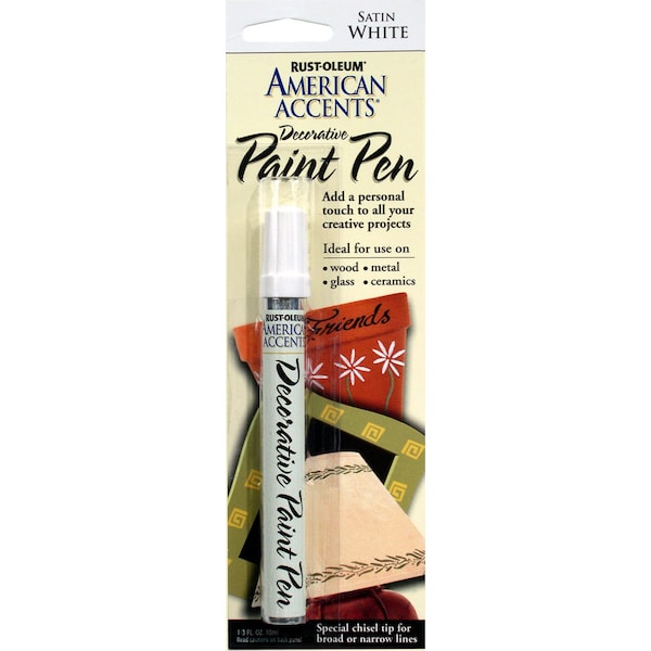 Rust-Oleum American Accents Decorative Paint Pens are designed to decorate and personalize your crafts and projects with a bold satin finish. With durable, permanent coverage, the paint pens allow you to bring ultimate creativity to your picture's frames, candy jars, vases, storage bins, greeting cards, candle holders and more. Special chisel tip provides broad or narrow application.