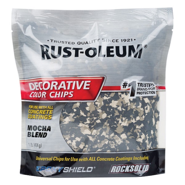 Rust-Oleum Decorative Chips are designed for use with any one-part or two-part concrete floor coating. When sprinkled onto a freshly coated surface, these decorative chips bond to the wet film to become a permanent part of the coating.