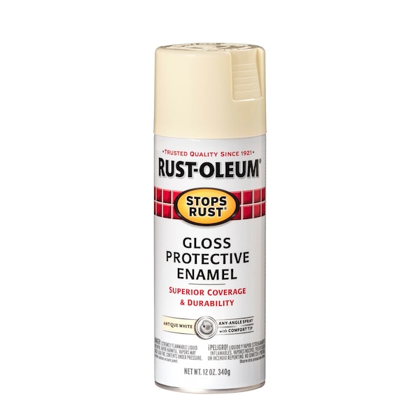 Spray Paint, Antique White, Gloss Paint and Primer Finish, Net Weight 12 oz, Paint and Primer Surface Material Metal, Wood, Solvent Base Type, Resin Type Modified Alkyd, Interior/Exterior, MIR COMP Standards, Dry Time Tack Free 2 to 4 hr